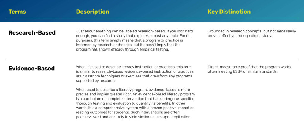 For schools and districts, the language used to describe literacy programs is a signal of the quality and extent of evidence supporting them. Understanding these distinctions helps educators choose programs that are not only well-designed but also have a track record of effectiveness.
